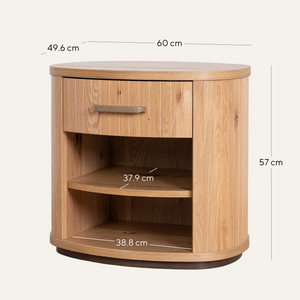 - Open shelving beneath drawer for books, décor, or essentials